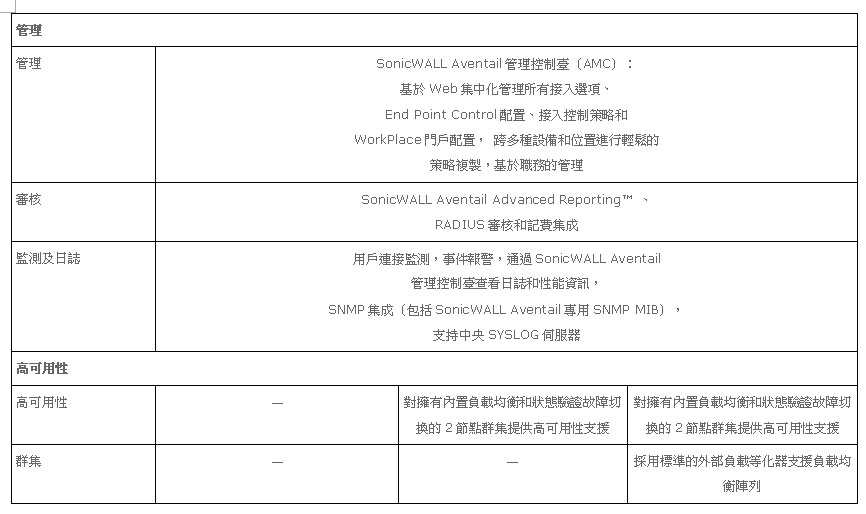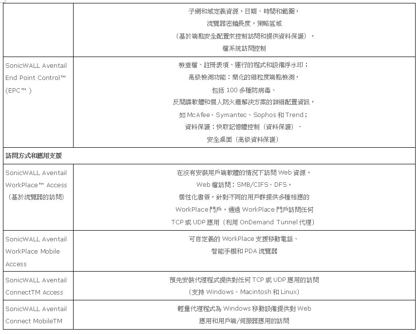 - 穩健可靠的移動解決方案。SonicWALL Aventail E-Class SSL VPN為移動PDA和智慧手機提供最強健可靠的安全訪問解決方案,其特點是無論在辦公室、家庭或移動IP位址之間如何交互均無需重新驗證的會話保持功能。