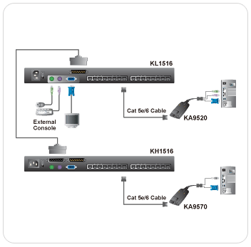 16埠Cat 5雙滑軌LCD KVM多電腦切換器 ALTUSEN KL1516 Cat 5雙滑軌LCD KVM多電腦切換器內建可分別獨立抽拉的17/19吋LCD螢幕與鍵盤/滑鼠觸控板。一台KL1516可控制多達16台伺服器,為了提高可靠度與效率,KL1516採用RJ-45接頭與Cat 5e/6線材連接伺服器。另外,透過連接各種電腦端模組,KL1516可支援包括PC、Mac、Sun電腦、以及序列裝置。