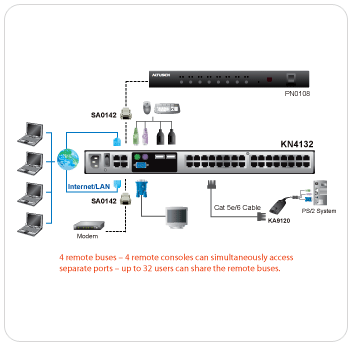 管理 提供多達64組使用者帳號-支援多達32位使用者同時分享控制 支援中止連線功能 – 管理者可中止正在運行的連線作業 支援事件日誌及Windows作業系統的log server 透過E-mail及SNMP trap通知重要系統事件;支援Syslog NEW! 支援韌體更新 數據機撥號及回撥功能 電腦端模組ID 連接埠分享模式支援多位使用者共同存取一台伺服器 可與ALTUSEN CC2000管理軟體整合使用 可與Power Over the NET™ 遠端電源管理方案整合,提供遠端電源控管l
