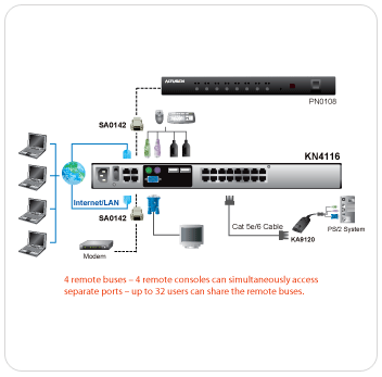 管理 提供多達64組使用者帳號-支援多達32位使用者同時分享控制 支援中止連線功能 – 管理者可中止正在運行的連線作業 支援事件日誌及Windows作業系統的log server 透過E-mail及SNMP trap通知重要系統事件;支援Syslog NEW! 支援韌體更新 數據機撥號及回撥功能 電腦端模組ID 連接埠分享模式支援多位使用者共同存取一台伺服器 可與ALTUSEN CC2000管理軟體整合使用 可與Power Over the NET™ 遠端電源管理方案整合,提供遠端電源控管l